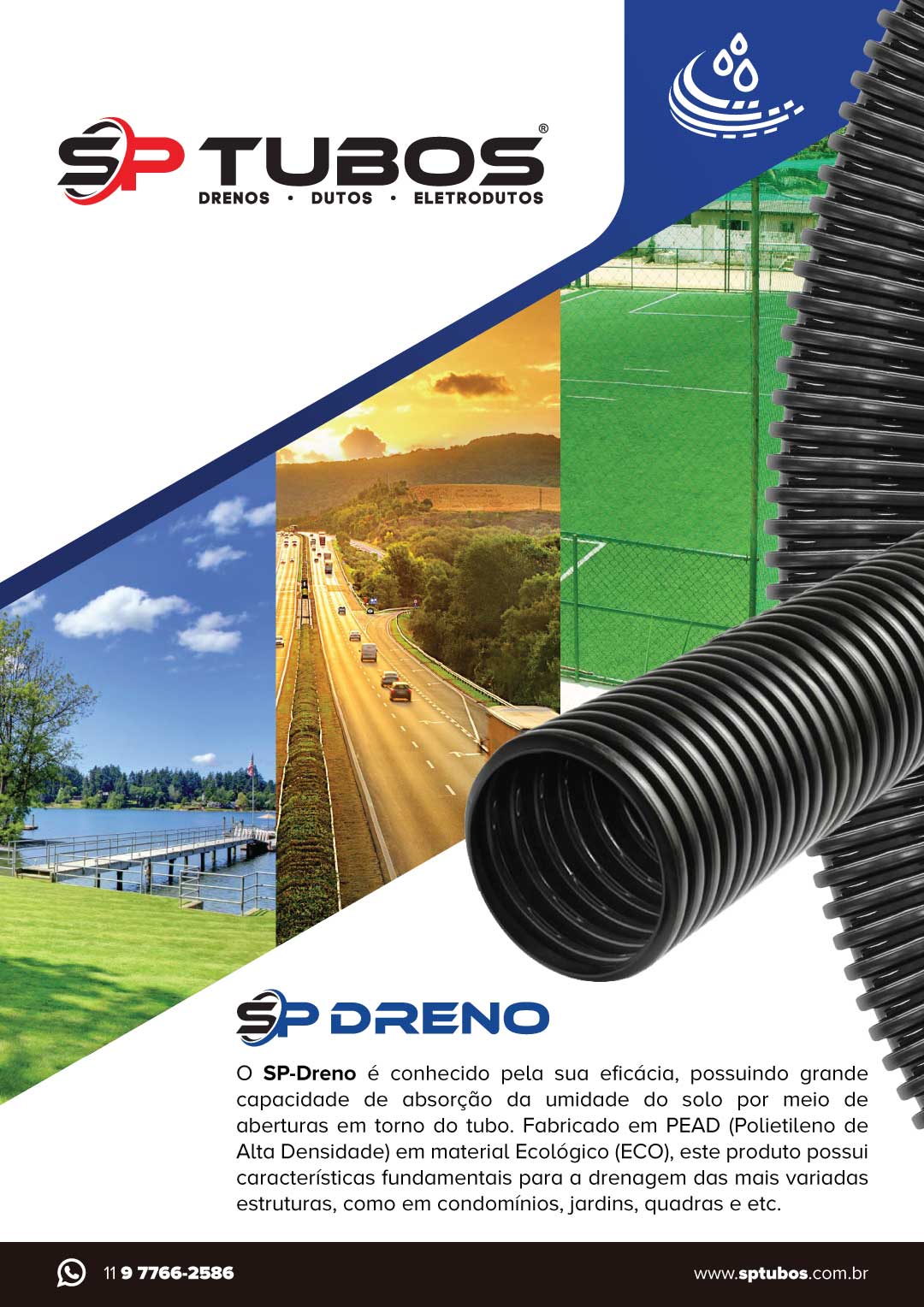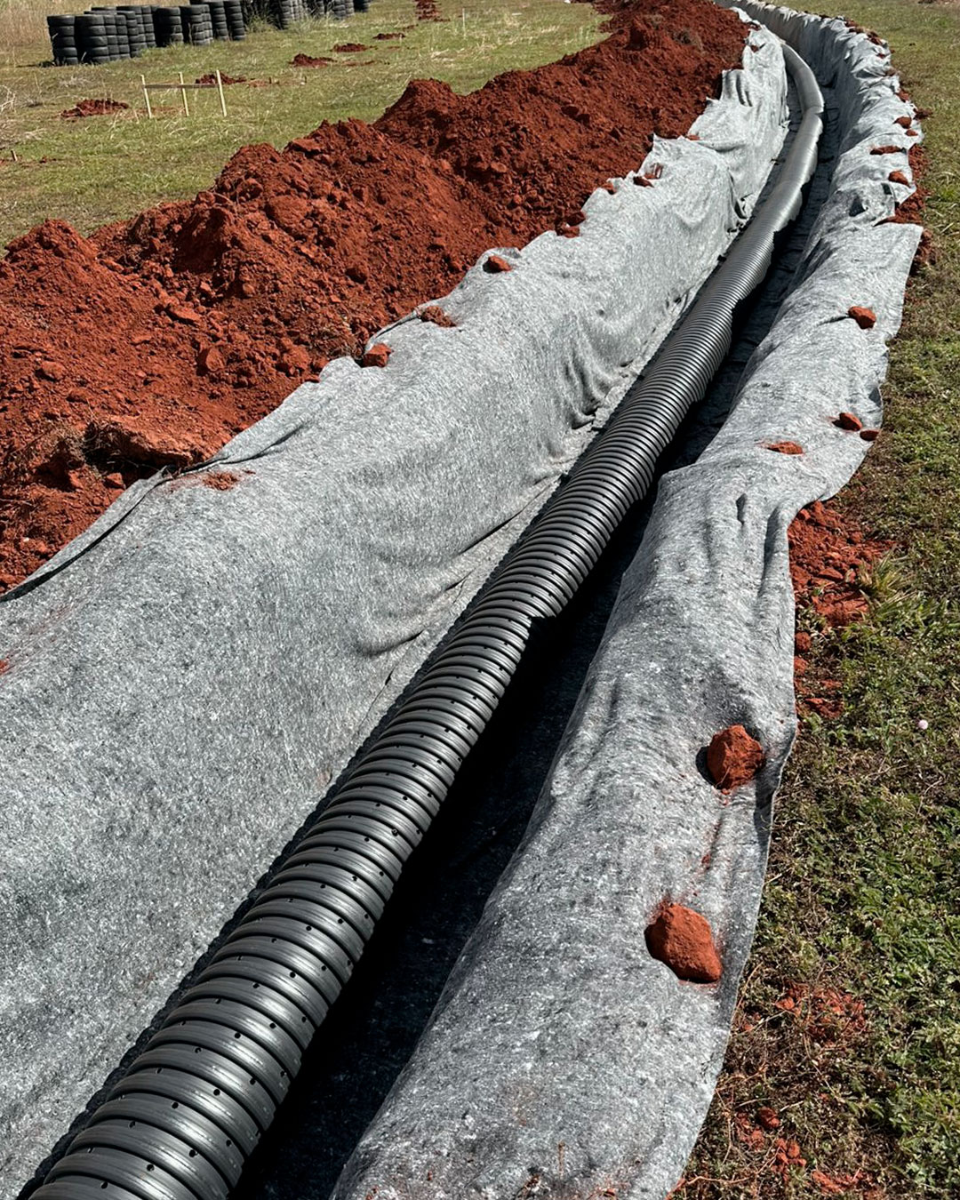 Drenagem de subsolos, campos esportivos e valas de absorção, evitando acúmulo de água e danos à estrutura.